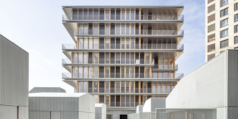 Estores enrollables exteriores con el tejido Satiné 5500 en el color 0606 Bronce para viviendas colectiva.