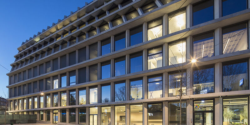 En la fachada sur se desplegaron 320 estores de enrollamiento ZIP de tejido Satiné 5500 de color 0130 Gris Charcoal, es decir 6000 m² , divididos entre: