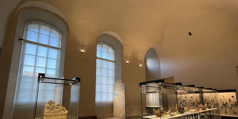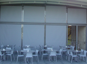 28 estores interiores (Gauthier & Cie) instalados en ventanales de 5 m de altura, están equipados con nuestro tejido SV 5 % color 0220 Blanco Lino y proporcionan una buena protección contra el calor al tiempo que protegen las obras expuestas de los rayos UV. La vistaal exterior y la luz natural se conservan gracias a la transparencia del tejido.