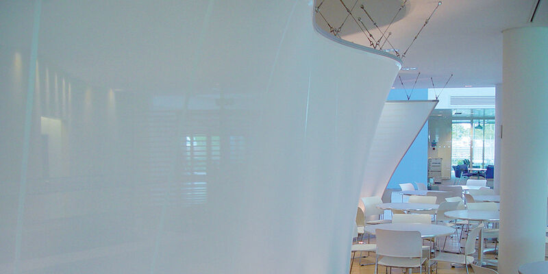 La tela dibuja una separación fluida que limita las diferentes zonas del restaurante. Su transparencia déjà pasar la luz natural y aporta un toque de refinamiento.